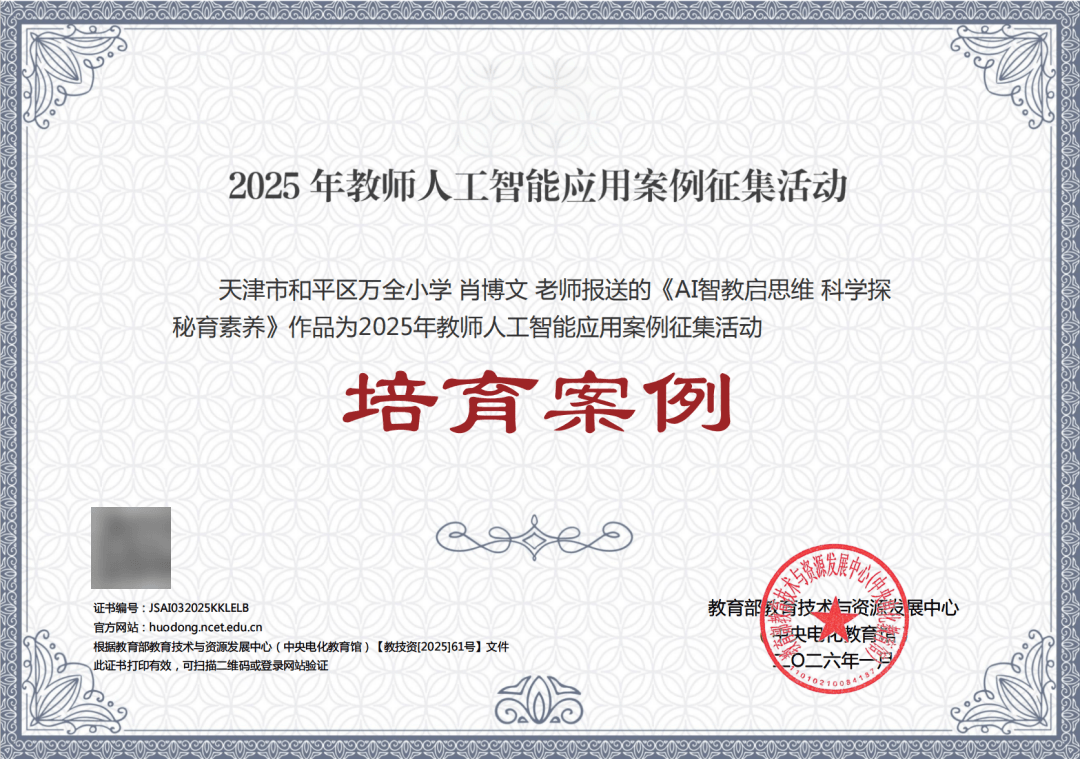 展示了我校正在“人工智能+教育”融合实践中的积极摸索取阶段。查看更多本次案例搜集勾当由天津市教委同一组织摆设,也是万全小学结实推进教育数字化计谋、系统提拔教师消息素养的缩影。此次获,肖博文教员设想的《AI智教启思维 科学探秘育素养》案例,